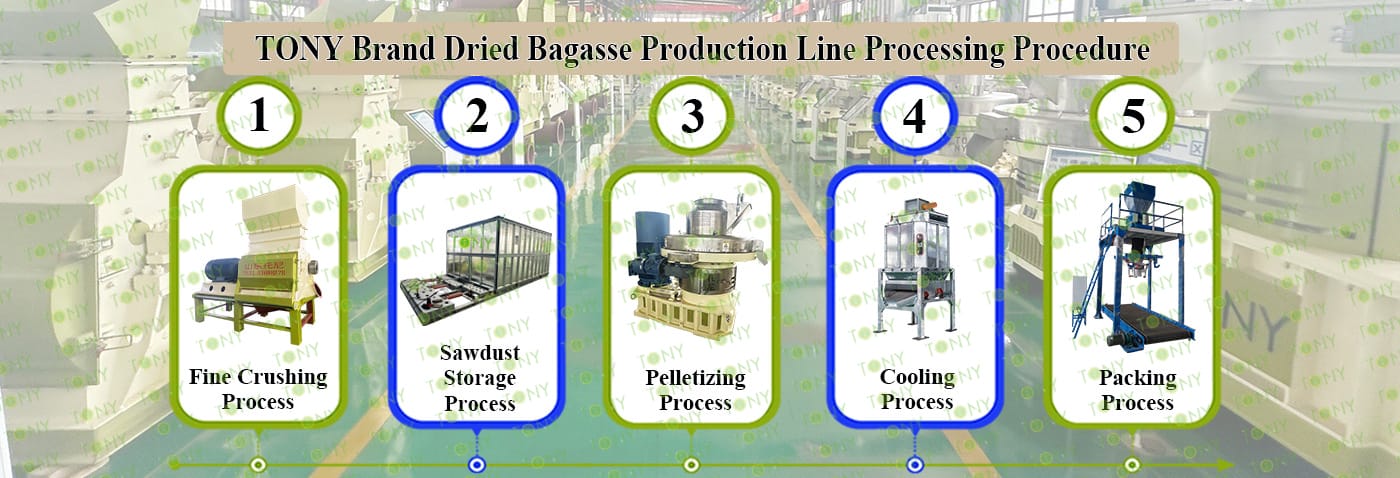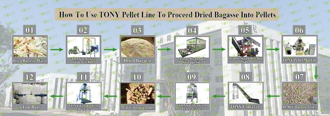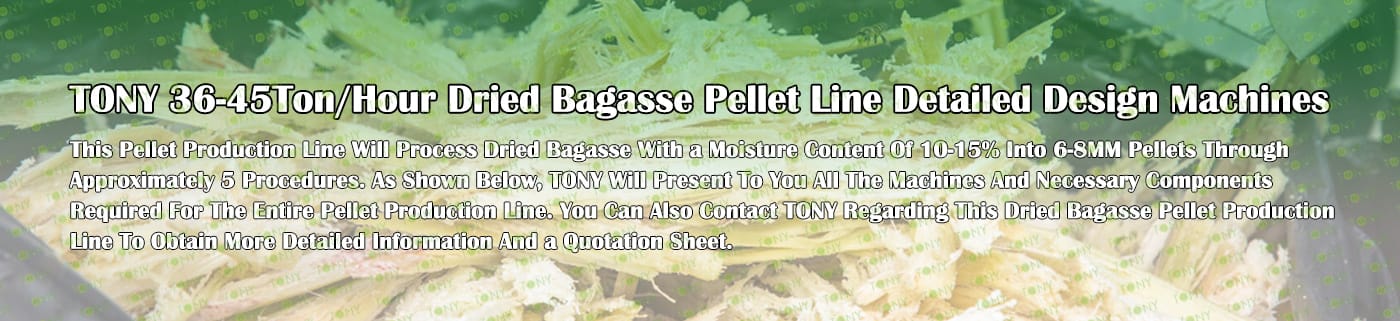TONY Brand 36-45Ton/Hour Dried Bagasse Pellet Manufacturing Plant can take dried bagasse as the main raw material. After pretreatment and processing, it is solidified into high - density Bagasse pellet fuel. This fuel is an ideal substitute for coal and oil and plays a role in energy conservation and emission reduction. At present, it has been widely used in regions rich in bagasse resources.