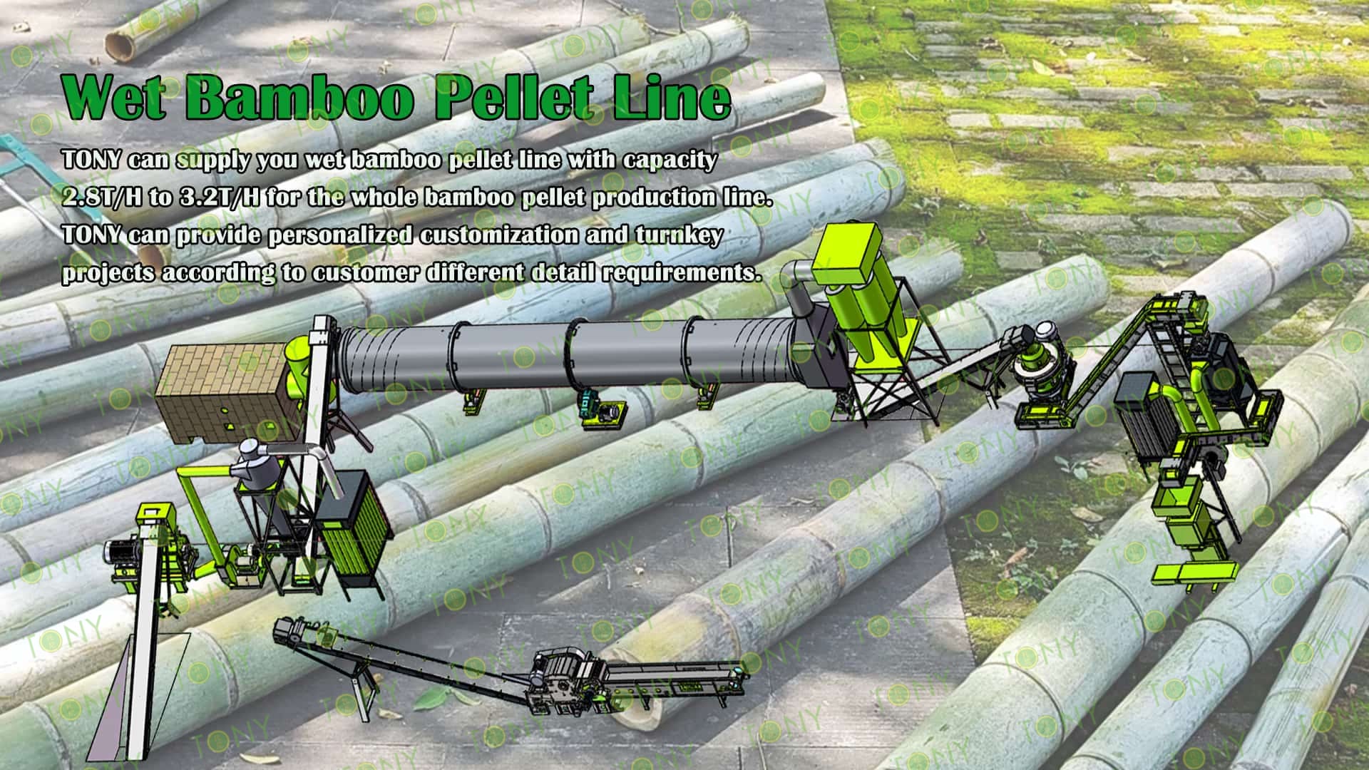 3.TONY Brand 2.8-3.2 Ton /Hour Wet Bamboo Pellet Line Project Process