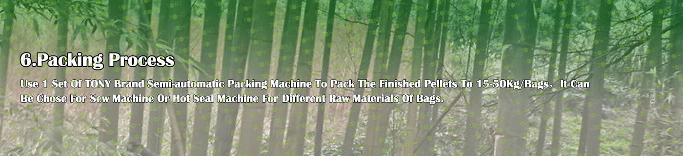 6. Main Equipment: Wood Chipper TPQ216 - 55KW, Effective Hammer Mill-TFD75*100-90KW, Rotary Drum Dryer-1.8*15m, TONY Pellet Machine TYJ760-Ⅲ-185KW, Galvanized Pellets Cooler, Semi-automatic Packing Machine and Belt Conveyors