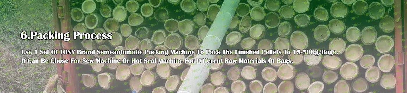 6. Main Equipment: Wood Chipper TPQ216 - 55KW, Effective Hammer mill-TFD75*132-132KW, Rotary Drum Dryer-1.8*20m, TONY Pellet Machine TYJ860-Ⅲ-280KW, Galvanized Pellets Cooler, Semi-automatic Packing Machine and Belt Conveyors