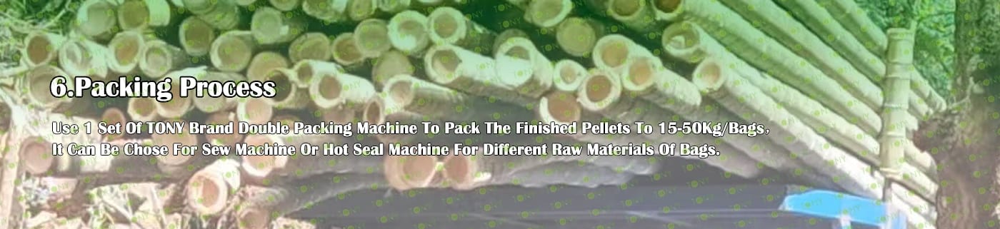 6. Main Equipment: Comprehensive Chipper TPC1000 - 90KW, Effective Hammer Mill-TFD85*250-250KW, Rotary Drum Dryer-2.2*24m, TONY Pellet Machine TYJ551-Ⅲ-132KW,Pellet Cooler, Double Packing Machine and Belt Conveyors