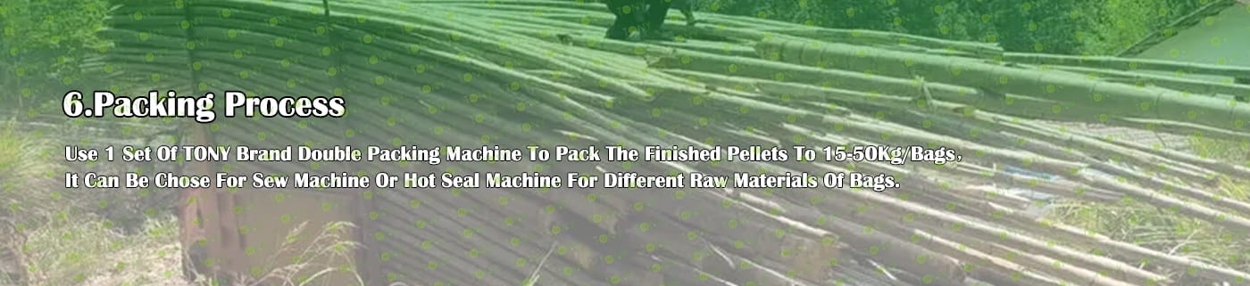 6. Main Equipment: Comprehensive Chipper TPC1300-132KW, Effective Hammer Mill-TFD75*132-132KW, Rotary Drum Dryer-2.5*24m, TONY Pellet Machine TYJ760 - Ⅲ - 200KW, Pellet Cooler, Double Packing Machine and Belt Conveyors