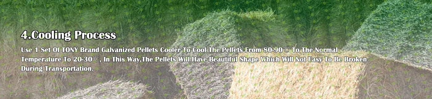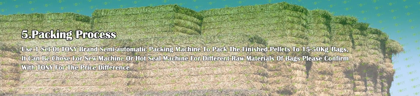 6. Main Equipment: Straw Cutter -TPX80-22KW, Multifunctional Hammer Mill- TFQ65*55-37KW, TONY Pellet Machine-TYJ551-III-90KW, Galvanized Pellets Cooler, Semi-automatic Packing Machine and Belt Conveyors