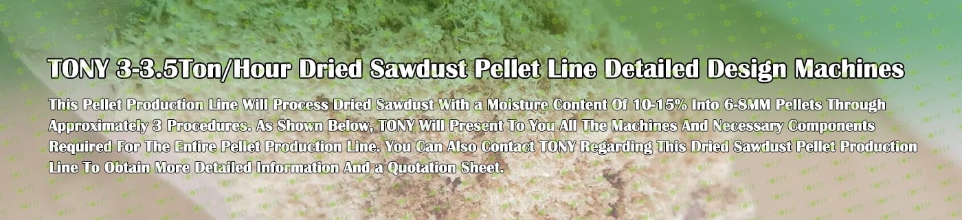 TONY Brand 3-3.5Ton/Hour Dried Sawdust Pellet Manufacturing Plant can take dried sawdust,wood chips, various types of wood - related biomass materials, such as wood pallets ,branches, wood logs, and wood shavings. After pretreatment and processing, dried sawdust is solidified into high - density wood pellet fuel. This fuel is an ideal substitute for coal and oil and plays a role in energy conservation and emission reduction.