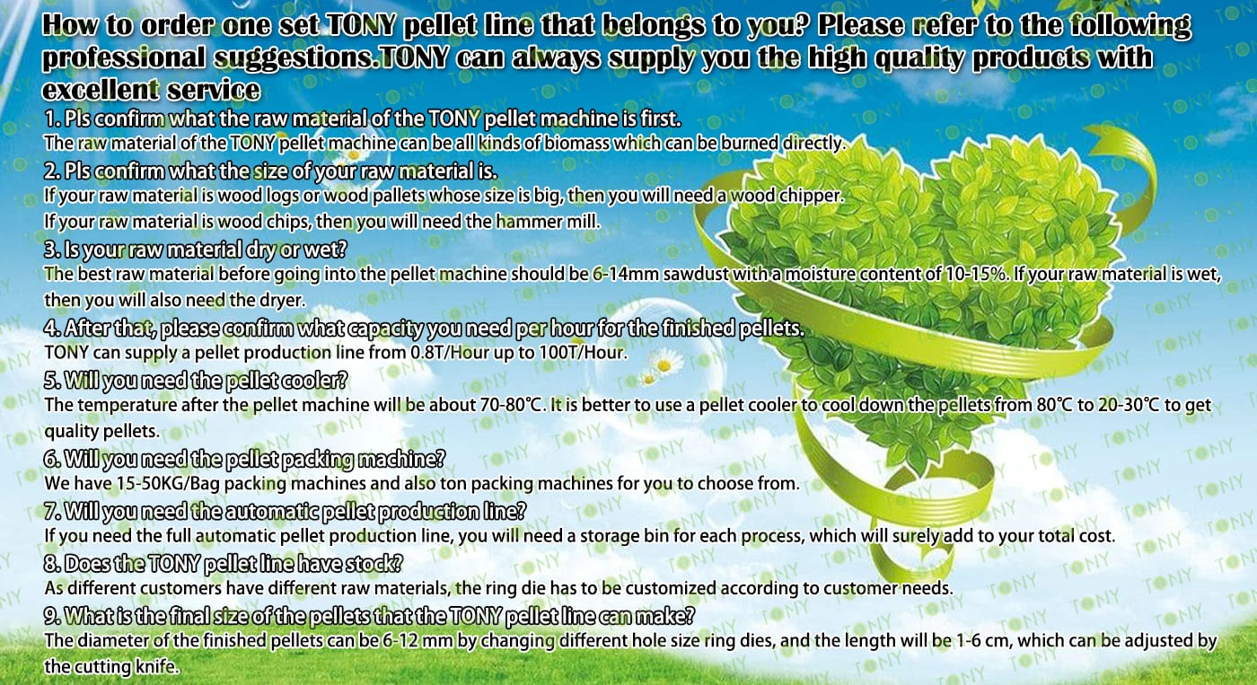 How to use the TONY pellet production line to make pellets from dried sawdust? The process mainly includes the following steps and equipment: 1. Use TONY vertical ring die pellet machine to produce pellets with a diameter of 6-8 mm. 2. Use TONY galvanized pellets cooler to cool the pellets from 80-90°C to 20-30°C. 3. Use TONY semi - automatic packing machine to pack the pellets into bags, each weighing 15-50 kg. For more detailed information and quotations, you can contact TONY. TONY can provide all the above - mentioned products at highly competitive prices and with excellent quality. |