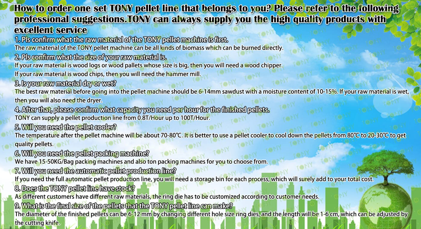 How to use the TONY pellet production line to make pellets from dried sawdust? The process mainly includes the following steps and equipment: 1. Use TONY vertical ring die pellet machine to produce pellets with a diameter of 6-8 mm. 2. Use TONY galvanized pellets cooler to cool the pellets from 80-90°C to 20-30°C. 3. Use TONY double packing machine to pack the pellets into bags, each weighing 15-50 kg. For more detailed information and quotations, you can contact TONY. TONY can provide all the above - mentioned products at highly competitive prices and with excellent quality. |