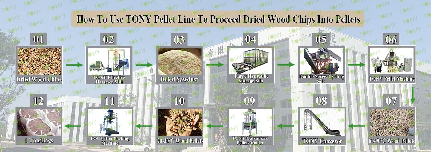 How to use the TONY pellet production line to make pellets from dried wood chips? The process mainly includes the following steps and equipment: 1. Use TONY effective hammer mill to crush the 25-55 mm wood chips into 8-14 mm sawdust. 2.Use TONY large hydraulic storage silo to storage 8-14 mm sawdust 3. Use TONY vertical ring die pellet machine to produce pellets with a diameter of 6-8 mm. 4. Use TONY galvanized pellets cooler to cool the pellets from 80-90°C to 20-30°C. 5. Use TONY ton packing machine to pack the pellets into bags, each weighing 1 ton. For more detailed information and quotations, you can contact TONY. TONY can provide all the above - mentioned products at highly competitive prices and with excellent quality. |