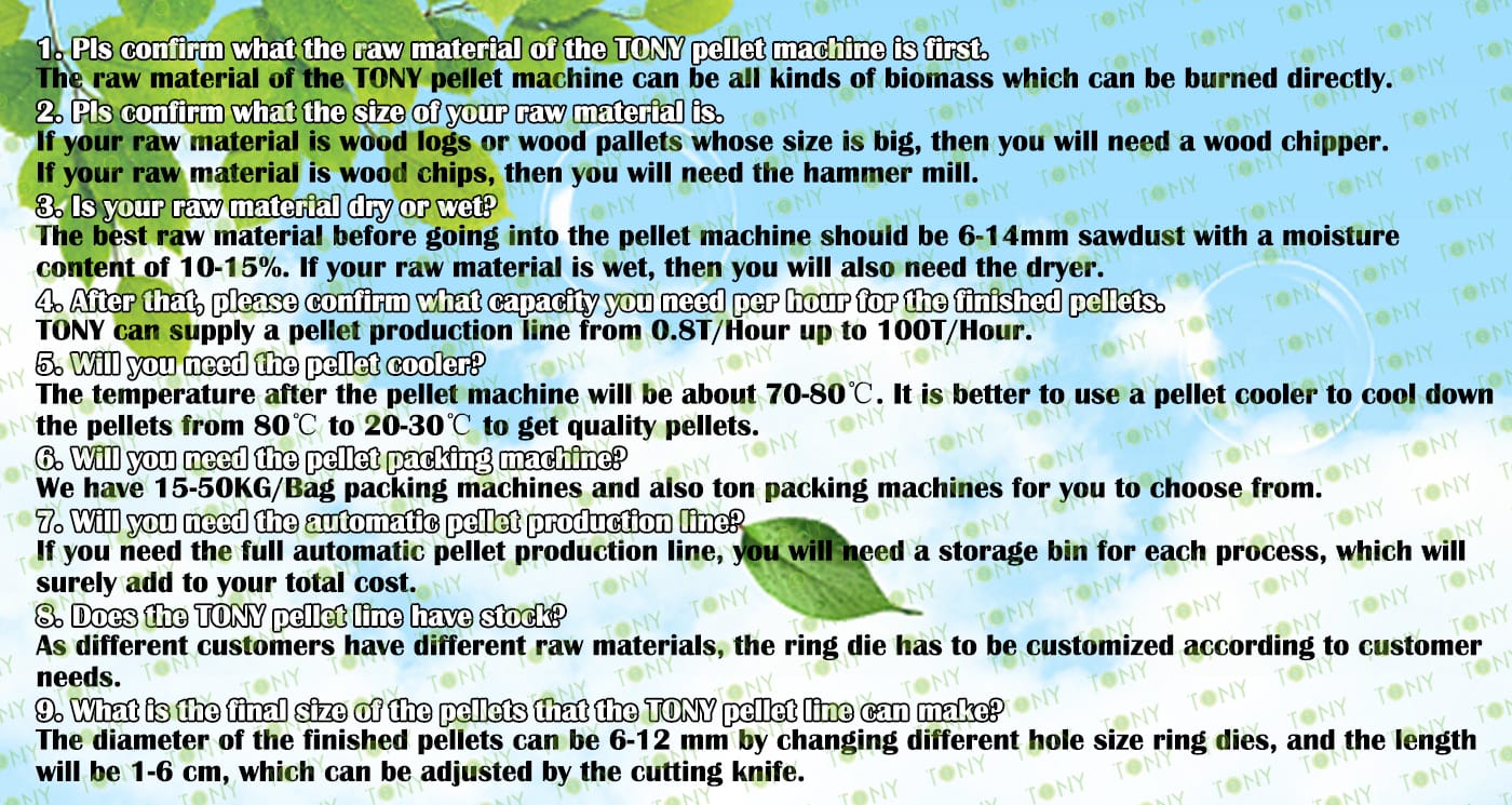 | Next, TONY Will Introduce To You All The Necessary Machinery That Will Be Used For The Whole Pellet Production Line. Some Machines Can Be Custom - Made By Customers According To Different Customers' Detailed Demands. Contact TONY For More Details, Including Quotation And Layout. | ||
