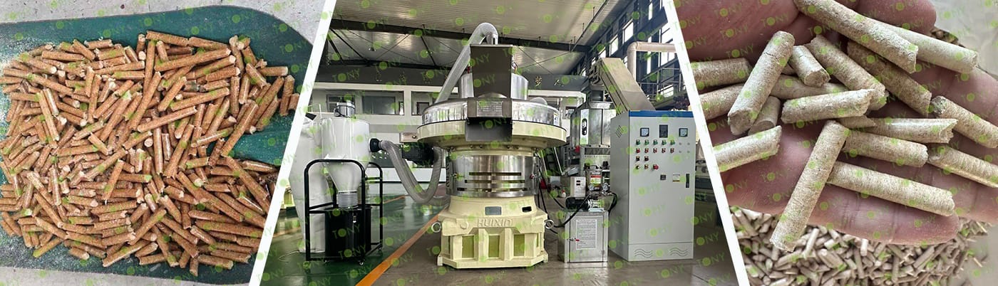 6. Main Equipment:Comprehensive Chipper TPC1000 - 90KW,Dual Shaft Hammer Mill-TFS65*100-110*2kw, TONY Pellet Machine TYJ760 - Ⅲ - 185kw, Pellet Cooler, Double Packing Machine and Belt Conveyors