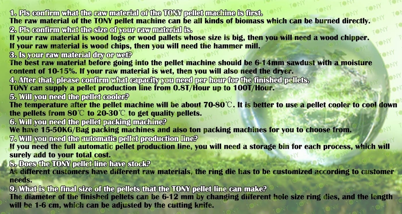 | Next, TONY Will Introduce To You All The Necessary Machinery That Will Be Used For The Whole Pellet Production Line. Some Machines Can Be Custom - Made By Customers According To Different Customers' Detailed Demands. Contact TONY For More Details, Including Quotation And Layout. | ||