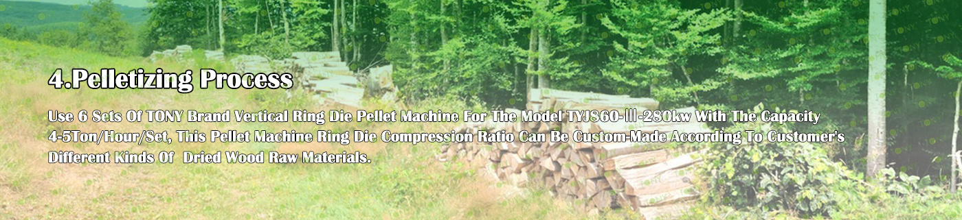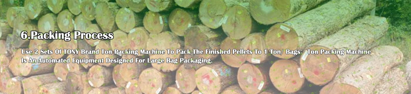 6. Main Equipment: Comprehensive Chipper TPC1400-600-200KW, Effective Hammer Mill-TFD85*220-220KW, TONY Large Hydraulic Storage Silo,TONY Pellet Machine TYJ860-Ⅲ-280KW, Pellet Cooler, Ton Packing Machine and Belt Conveyors