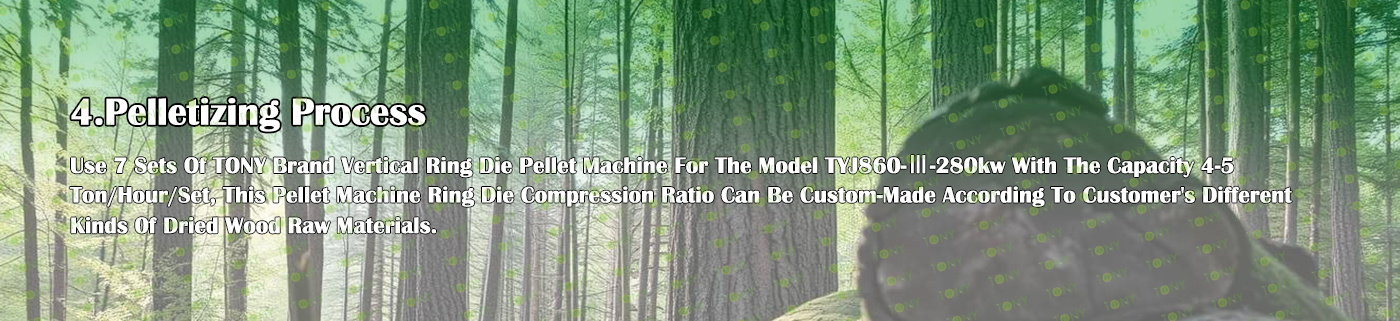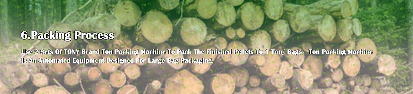 6. Main Equipment: Comprehensive Chipper TPC1400-700-250KW, Effective Hammer Mill-TFD85*250-250KW, TONY Large Hydraulic Storage Silo,TONY Pellet Machine TYJ860-Ⅲ-280KW, Pellet Cooler, Ton Packing Machine and Belt Conveyors