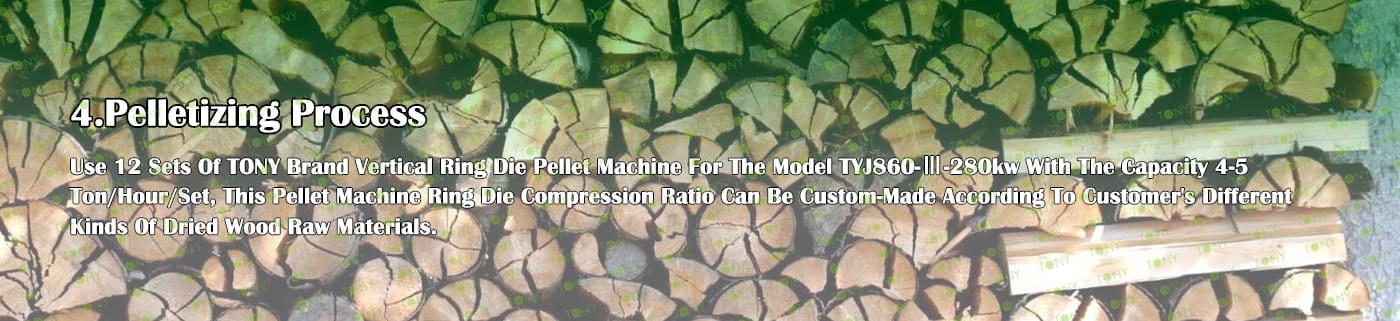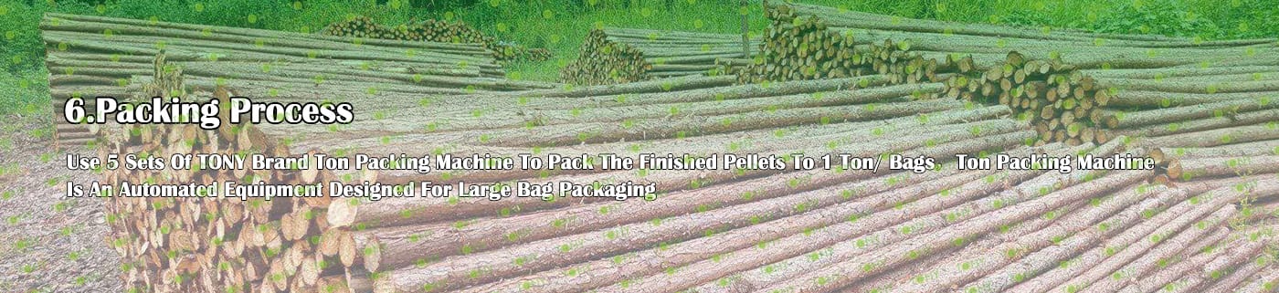 6. Main Equipment: Comprehensive Chipper TPC1600-1000-315KW, Effective Hammer Mill-TFD120*200-355KW, TONY Large Hydraulic Storage Silo,TONY Pellet Machine TYJ860-Ⅲ-280KW, Pellet Cooler, Ton Packing Machine and Belt Conveyors