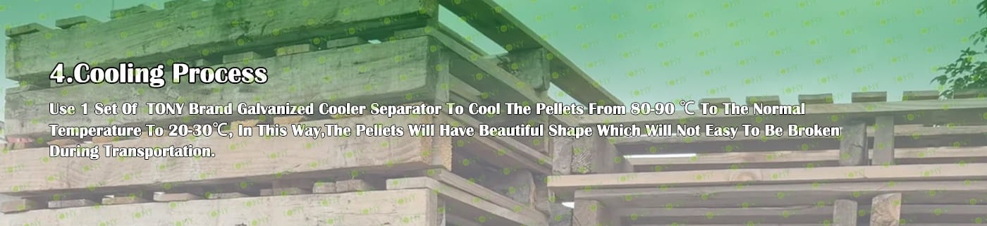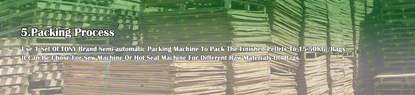 6. Main Equipment: Comprehensive Chipper TPC1000-90KW, Multifunctional Hammer Mill-TFQ65*55-37KW, TONY Pellet Machine TYJ450-II-55KW, Pellet Cooler, Semi-automatic Packing Machine and Belt Conveyors