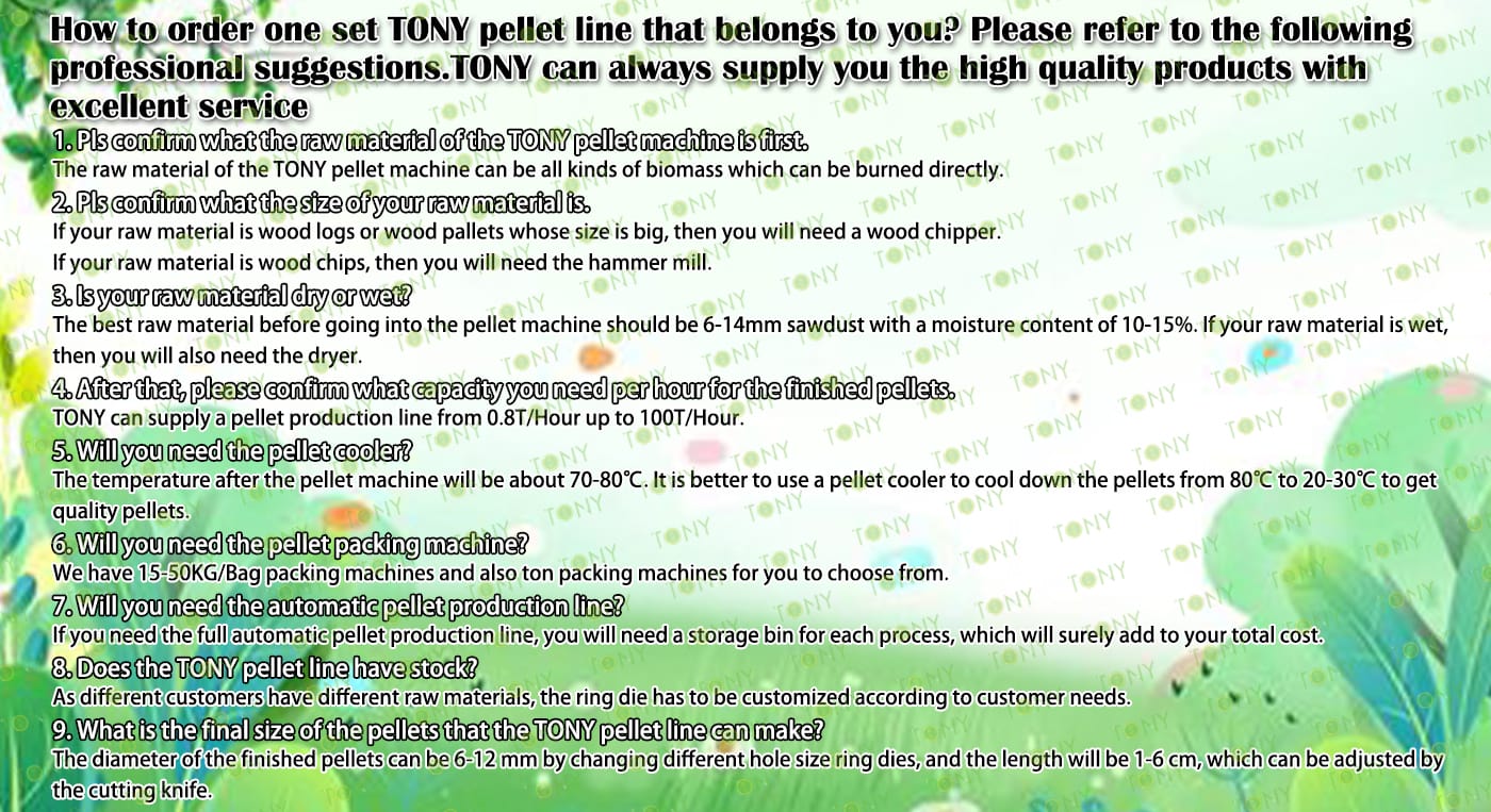 | Next, TONY Will Introduce To You All The Necessary Machinery That Will Be Used For The Whole Pellet Production Line. Some Machines Can Be Custom - Made By Customers According To Different Customers' Detailed Demands. Contact TONY For More Details, Including Quotation And Layout. | ||