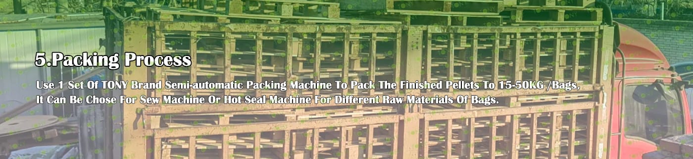 6. Main Equipment: Comprehensive Chipper TPC1000-90KW, Effective Hammer Mill-TFD75*100-90KW, TONY Pellet Machine TYJ760-Ⅲ-185KW, Pellet Cooler, Semi-automatic Packing Machine and Belt Conveyors