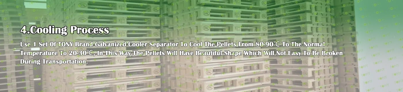4.Main Machine: Comprehensive Chipper,Hammer Mill, TONY Pellet Machine TYJ760-III-185KW,Pellets Cooler,Packing Machine And Belt Conveyors
