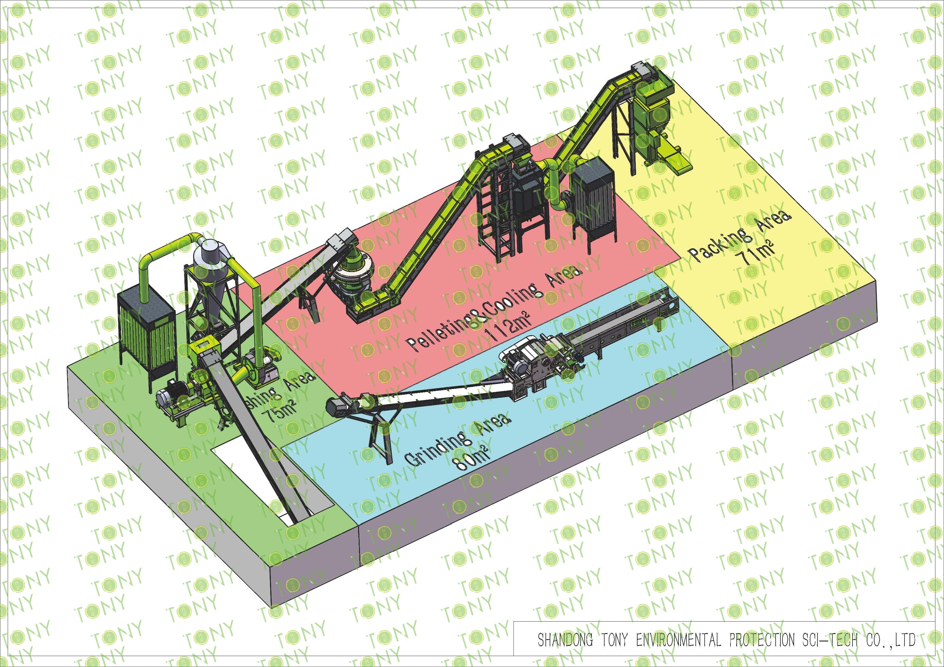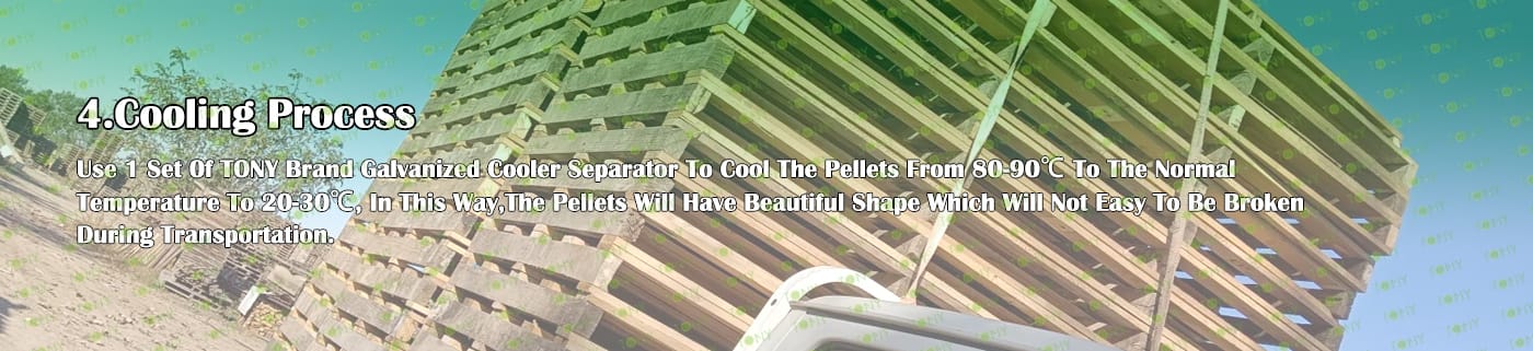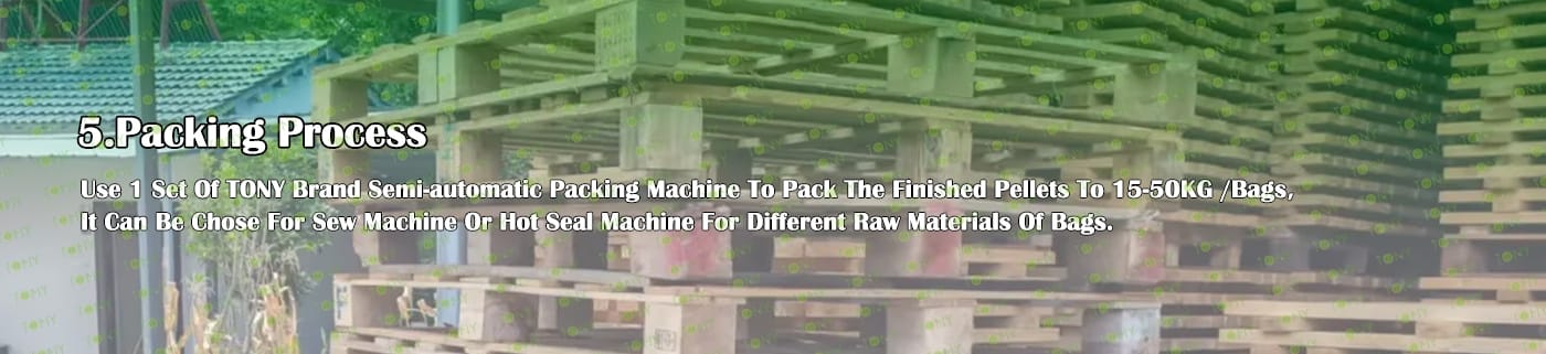 6. Main Equipment: Comprehensive Chipper TPC1000-90KW, Effective Hammer mill-TFD75*100-90KW, TONY Pellet Machine TYJ760-Ⅲ-200KW, Pellet Cooler, Semi-automatic Packing Machine and Belt Conveyors