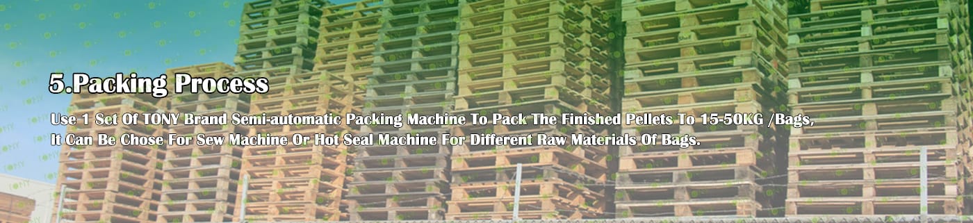 6. Main Equipment: Comprehensive Chipper TPC1000-90KW, Effective Hammer Mill-TFD75*100-110KW, TONY Pellet Machine TYJ551-Ⅲ-110KW, Pellet Cooler, Semi-automatic Packing Machine and Belt Conveyors