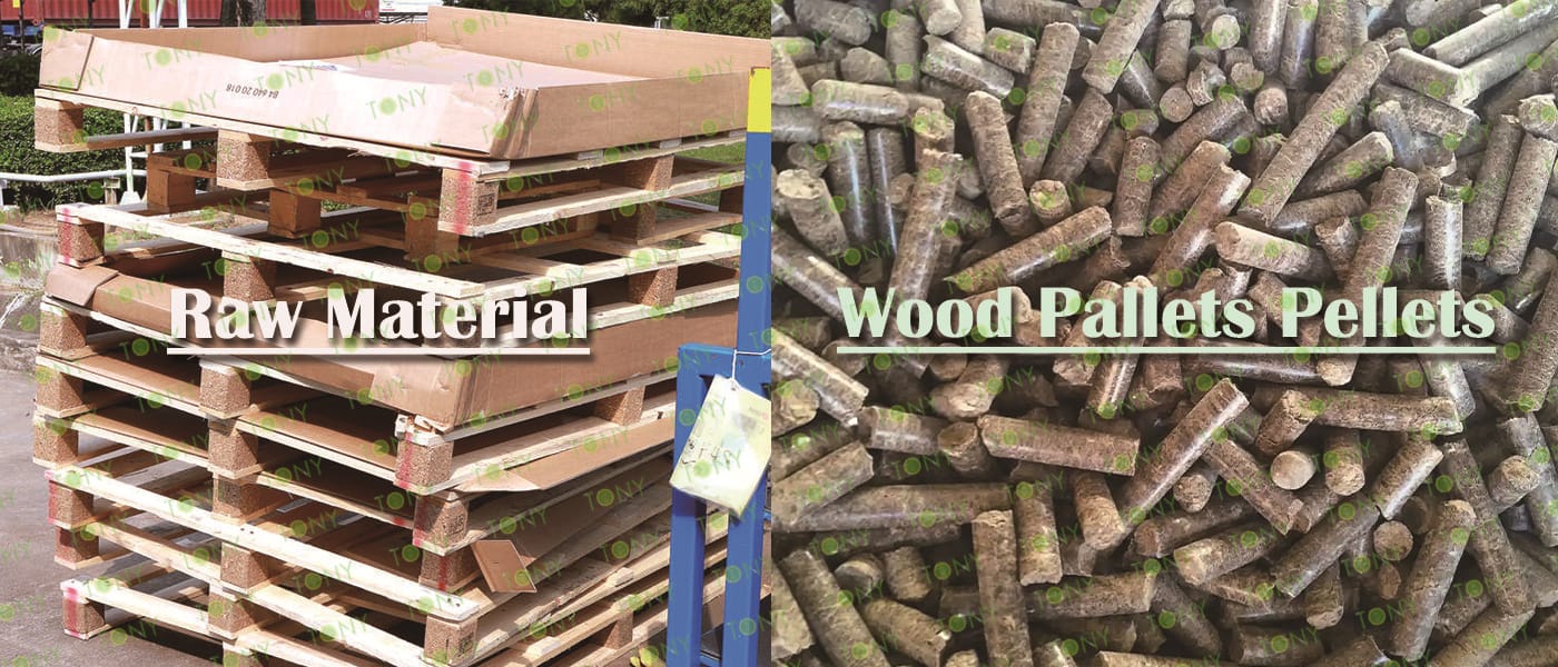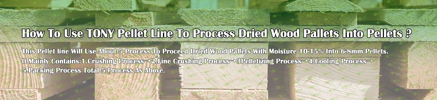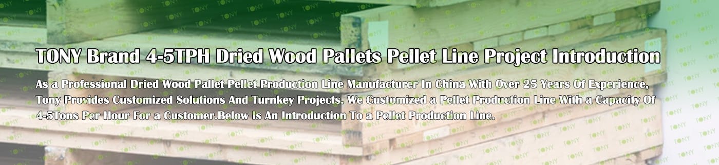 TONY Brand 4-5Ton/Hour Dried Wood Pallets Pellet Manufacturing Plant can take dried wood pallets, various types of wood - related biomass materials, such as branches, small - diameter logs, and wood shavings. After pretreatment and processing, dried wood pallets is solidified into high - density wood pellet fuel.The content of pollutants such as sulfur dioxide and nitrogen oxides produced by biomass pellets during combustion is extremely low, and the dust emission is also low, which can effectively reduce air pollution. Moreover, the raw material sources of biomass pellets are very wide, and the combustion efficiency is high. Compared with traditional fossil energy, it reduces the production and use costs and has higher economic efficiency. It has received a lot of attention and promotion.