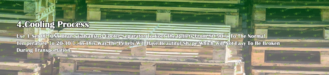6. Main Equipment: Comprehensive Chipper TPC1000-90KW, Effective Hammer Mill-TFD75*132-132KW, TONY Pellet Machine TYJ860-Ⅲ-280KW, Pellet Cooler, Semi-automatic Packing Machine and Belt Conveyors