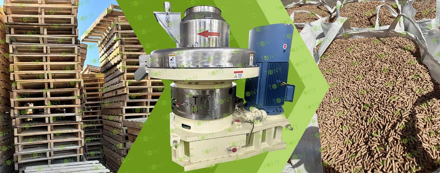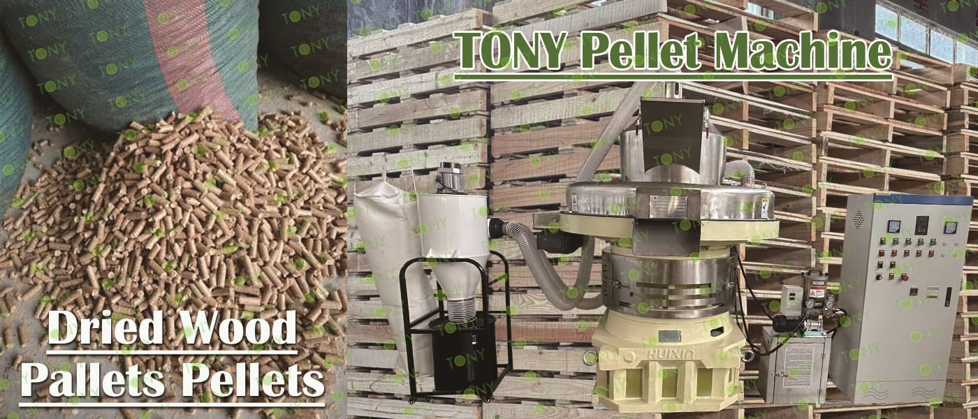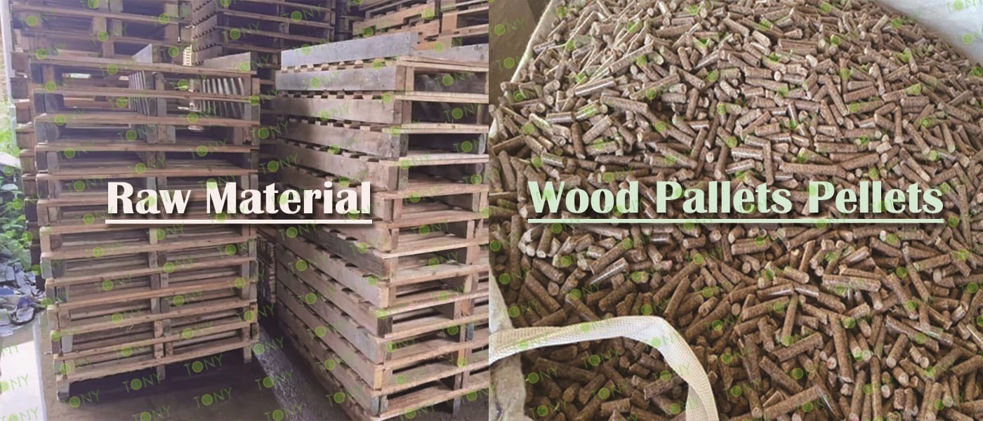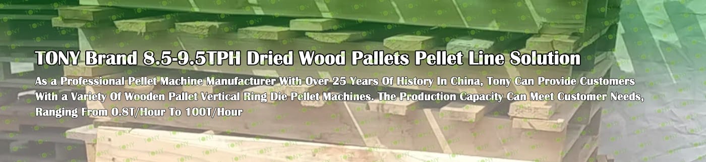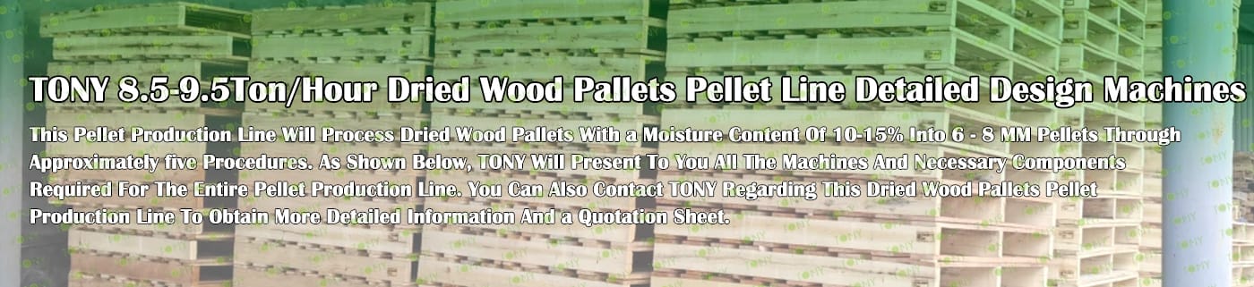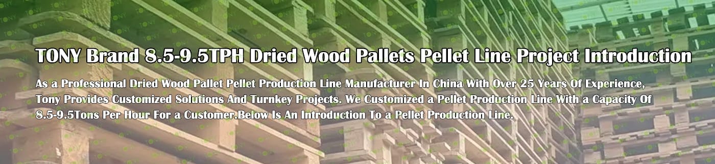 TONY Brand 8.5-9.5Ton/Hour Dried Wood Pallets Pellet Manufacturing Plant can take dried wood pallets, various types of wood - related biomass materials, such as branches, small - diameter logs, and wood shavings. After pretreatment and processing, dried wood pallets is solidified into high - density wood pellet fuel.The content of pollutants such as sulfur dioxide and nitrogen oxides produced by biomass pellets during combustion is extremely low, and the dust emission is also low, which can effectively reduce air pollution. Moreover, the raw material sources of biomass pellets are very wide, and the combustion efficiency is high. Compared with traditional fossil energy, it reduces the production and use costs and has higher economic efficiency. It has received a lot of attention and promotion.