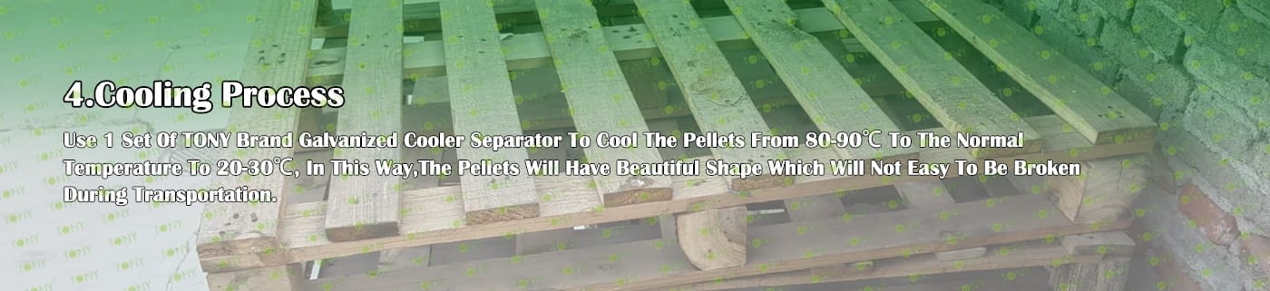 Finally, the finished product is processed: the hot pellets enter a cooler, where they are cooled to room temperature. They are then screened through a vibrating screen to remove debris and fines, resulting in qualified biomass pellets, completing the entire process.