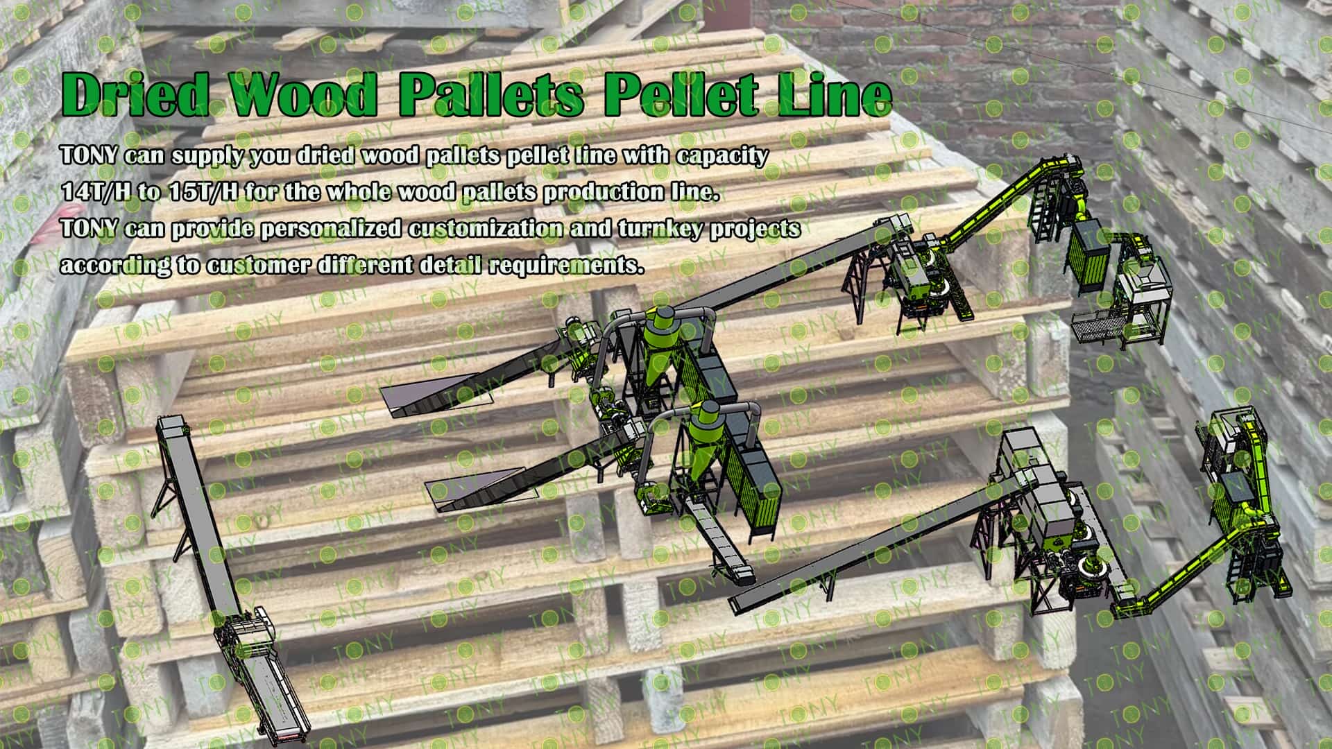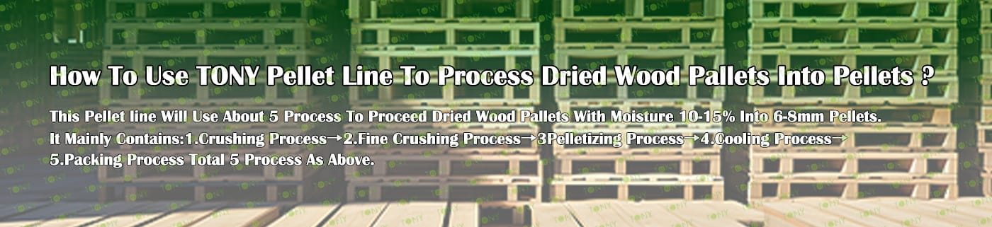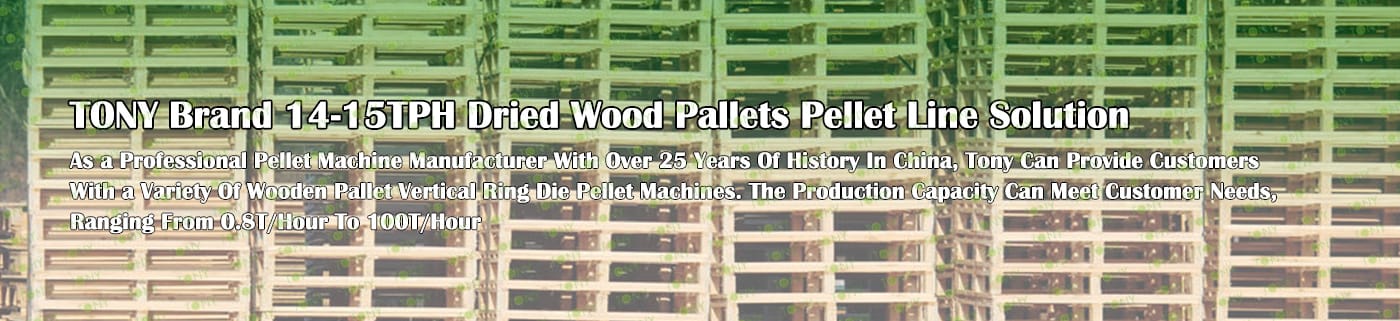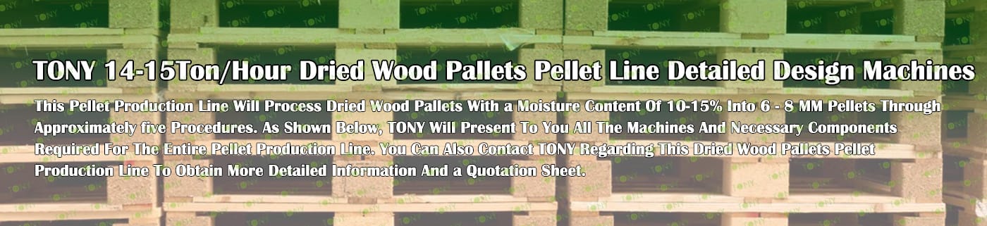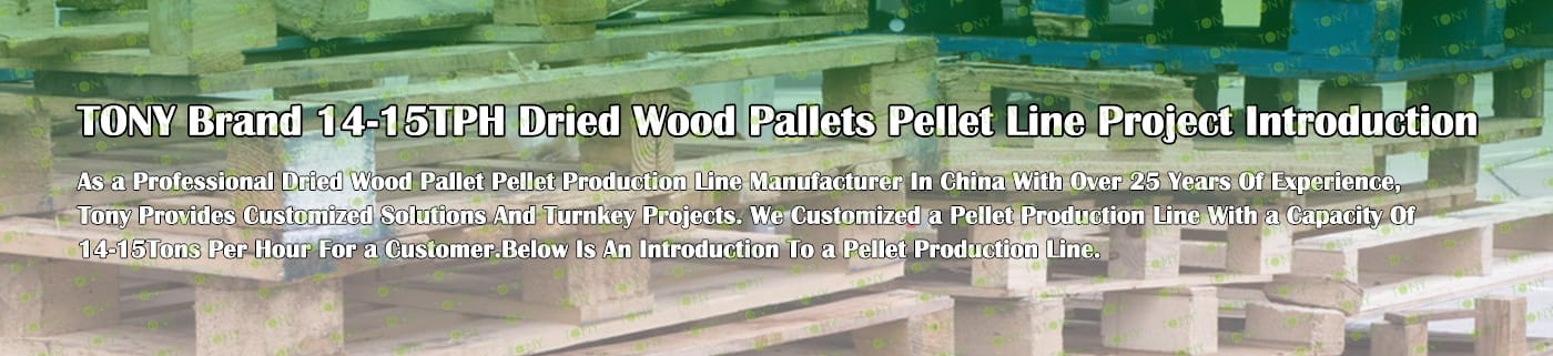 TONY Brand 14-15Ton/Hour Dried Wood Pallets Pellet Manufacturing Plant can take dried wood pallets, various types of wood - related biomass materials, such as branches, small - diameter logs, and wood shavings. After pretreatment and processing, dried wood pallets is solidified into high - density wood pellet fuel.The content of pollutants such as sulfur dioxide and nitrogen oxides produced by biomass pellets during combustion is extremely low, and the dust emission is also low, which can effectively reduce air pollution. Moreover, the raw material sources of biomass pellets are very wide, and the combustion efficiency is high. Compared with traditional fossil energy, it reduces the production and use costs and has higher economic efficiency. It has received a lot of attention and promotion.