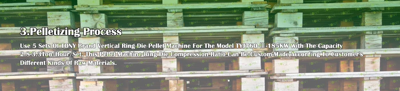 4.Main Machine: Comprehensive Chipper,Hammer Mill, TONY Pellet Machine TYJ760-Ⅲ-185KW,Pellets Cooler,Packing Machine And Belt Conveyors