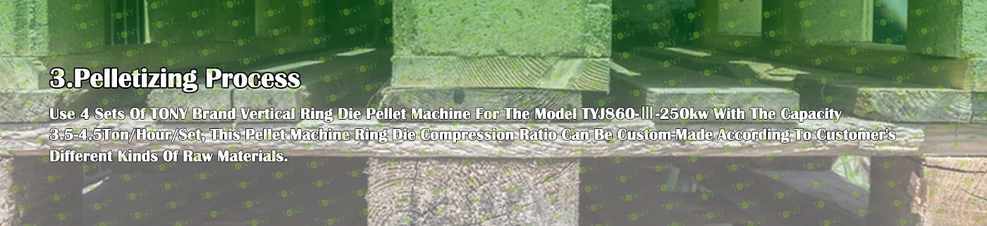 4.Main Machine: Comprehensive Chipper,Hammer Mill, TONY Pellet Machine TYJ860-Ⅲ-250KW,Pellets Cooler,Packing Machine And Belt Conveyors