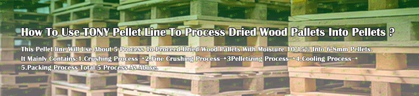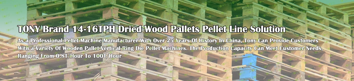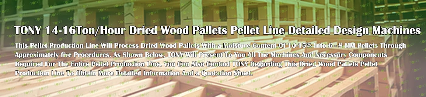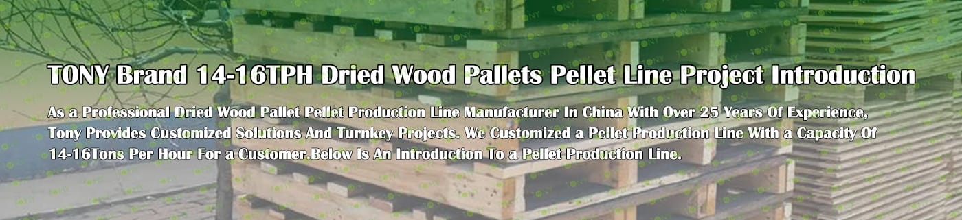 TONY Brand 14-16Ton/Hour Dried Wood Pallets Pellet Manufacturing Plant can take dried wood pallets, various types of wood - related biomass materials, such as branches, small - diameter logs, and wood shavings. After pretreatment and processing, dried wood pallets is solidified into high - density wood pellet fuel.The content of pollutants such as sulfur dioxide and nitrogen oxides produced by biomass pellets during combustion is extremely low, and the dust emission is also low, which can effectively reduce air pollution. Moreover, the raw material sources of biomass pellets are very wide, and the combustion efficiency is high. Compared with traditional fossil energy, it reduces the production and use costs and has higher economic efficiency. It has received a lot of attention and promotion.