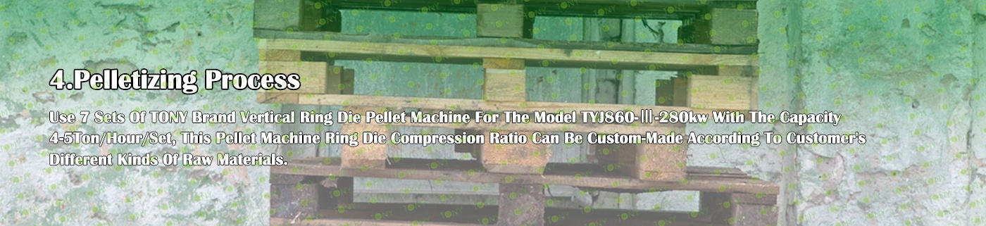 6. Main Equipment: Comprehensive Chipper TPC1400-700-250KW, Effective Hammer Mill-TFD85*250-250KW, TONY Large Hydraulic Storage Silo,TONY Pellet Machine TYJ860-Ⅲ-280KW, Pellet Cooler, Ton Packing Machine and Belt Conveyors.