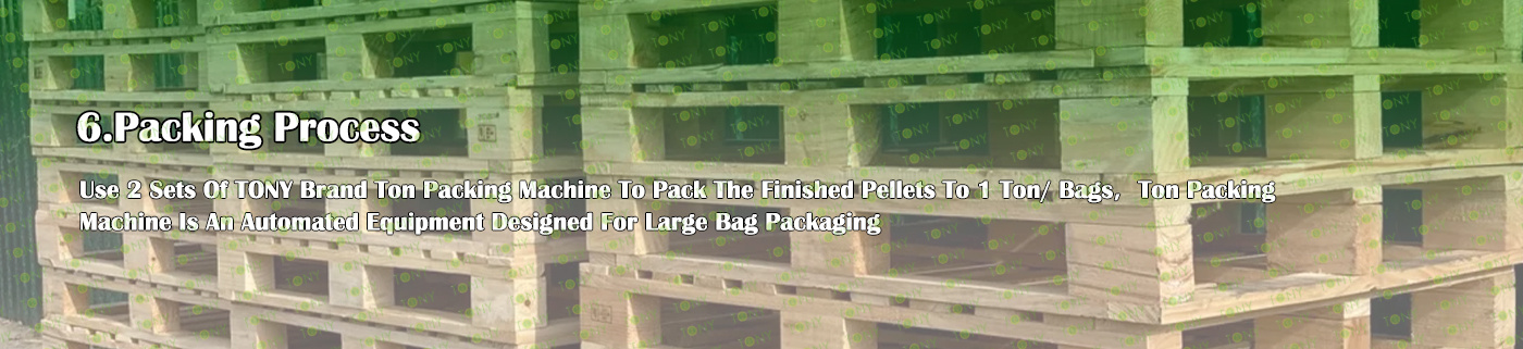 6. Main Equipment: Comprehensive Chipper TPC1600-1000-315KW, Effective Hammer Mill-TFD100-200-315KW, TONY Large Hydraulic Storage Silo,TONY Pellet Machine TYJ860-Ⅲ-280KW, Pellet Cooler, Ton Packing Machine and Belt Conveyors