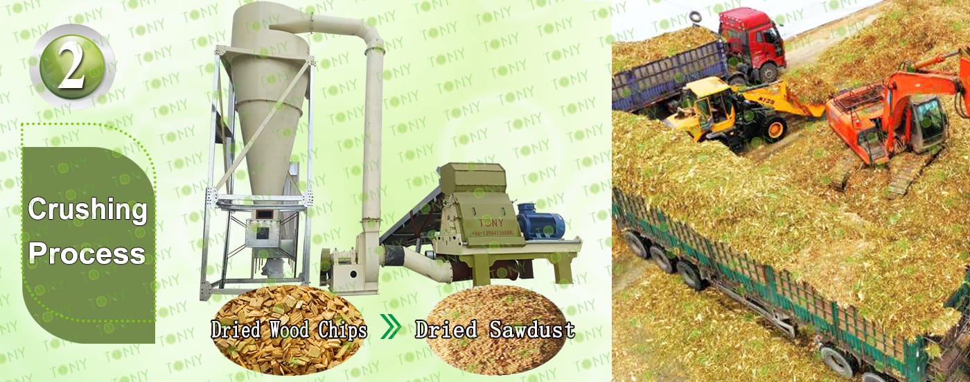 A.This process is mainly used to crush 25-55mm wood chips into 8-14mm sawdust.