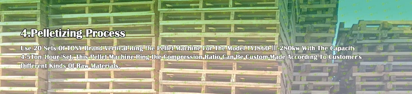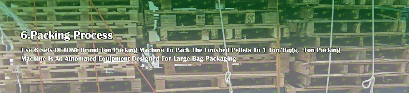 6. Main Equipment: Comprehensive Chipper TPC1800-500KW, Effective Hammer Mill-TFD1600-500KW, TONY Large Hydraulic Storage Silo,TONY Pellet Machine TYJ860-Ⅲ-280KW, Pellet Cooler, Ton Packing Machine and Belt Conveyors