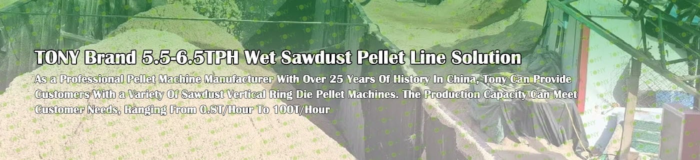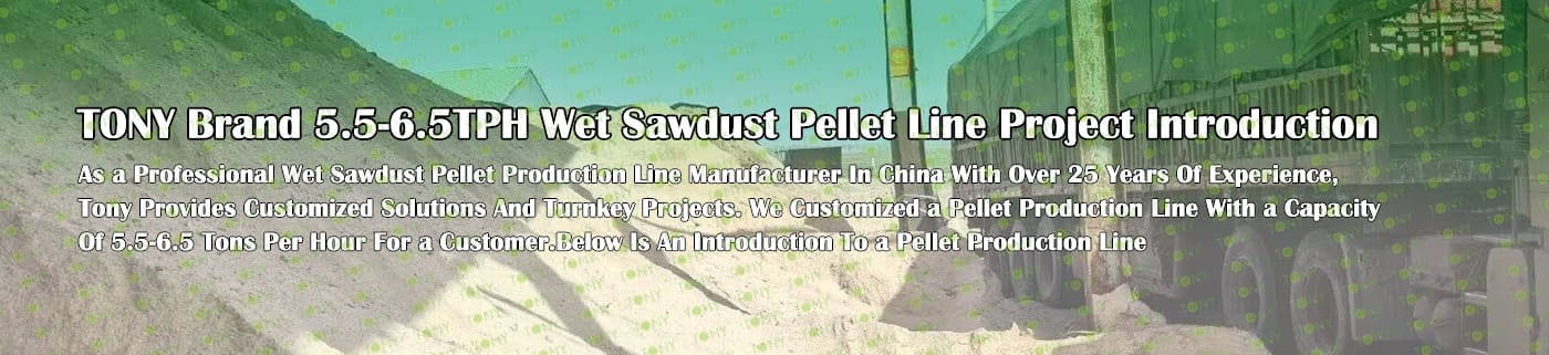 TONY Brand 5.5-6.5Ton/Hour Wet Sawdust Pellet Manufacturing Plant can take wet sawdust,wood chips, various types of wood - related biomass materials, such as wood pallets ,branches, wood logs, and wood shavings. After pretreatment and processing, wet sawdust is solidified into high - density wood pellet fuel. This fuel is an ideal substitute for coal and oil and plays a role in energy conservation and emission reduction.