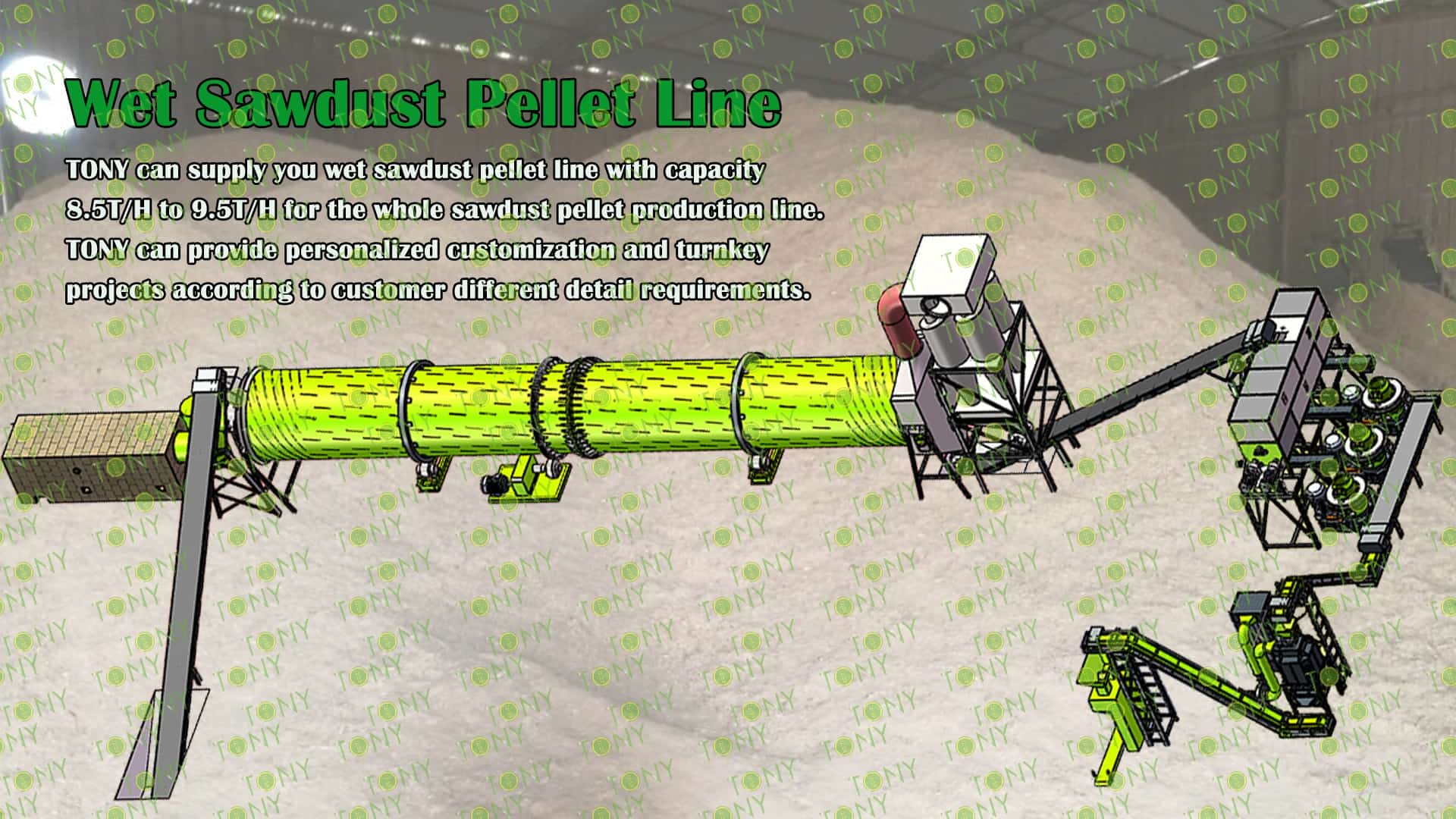 3.TONY Brand 8.5-9.5Ton /Hour Wet Sawdust Pellet Line Project Process