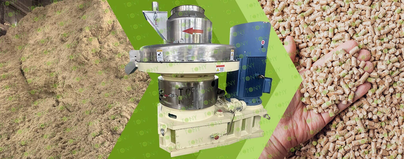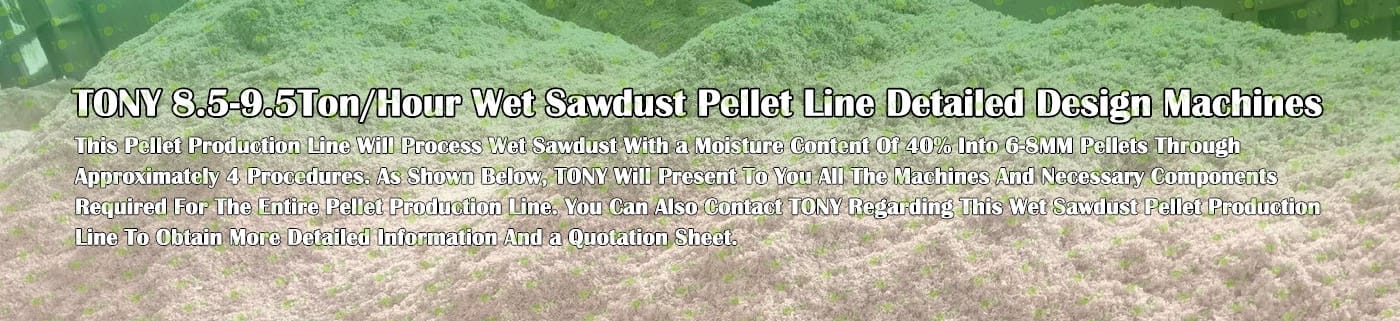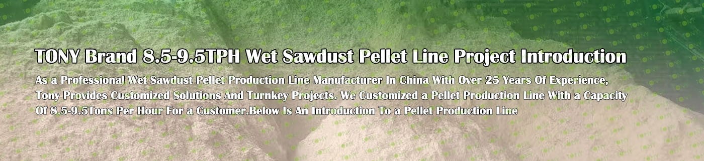 TONY Brand 8.5-9.5Ton/Hour Wet Sawdust Pellet Manufacturing Plant can take wet sawdust,wood chips, various types of wood - related biomass materials, such as wood pallets ,branches, wood logs, and wood shavings. After pretreatment and processing, wet sawdust is solidified into high - density wood pellet fuel. This fuel is an ideal substitute for coal and oil and plays a role in energy conservation and emission reduction.