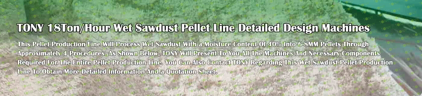 TONY Brand 18Ton/Hour Wet Sawdust Pellet Manufacturing Plant can take wet sawdust,wood chips, various types of wood - related biomass materials, such as wood pallets ,branches, wood logs, and wood shavings. After pretreatment and processing, wet sawdust is solidified into high - density wood pellet fuel. This fuel is an ideal substitute for coal and oil and plays a role in energy conservation and emission reduction.
