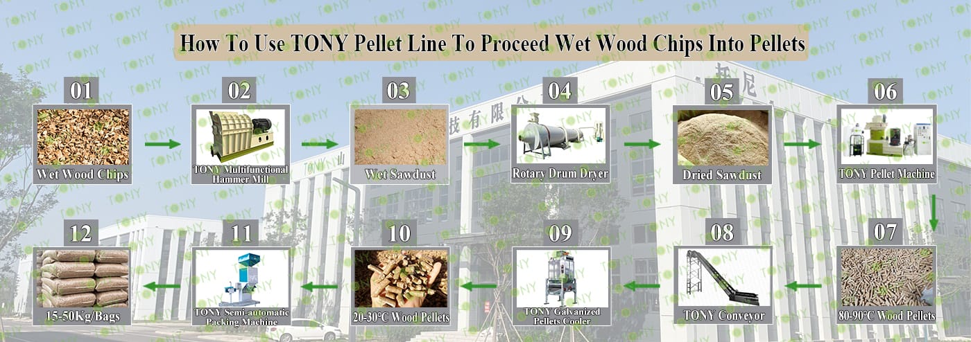3.TONY Brand 0.8-1.2Ton /Hour Wet Wood Chips Pellet Line Project Process