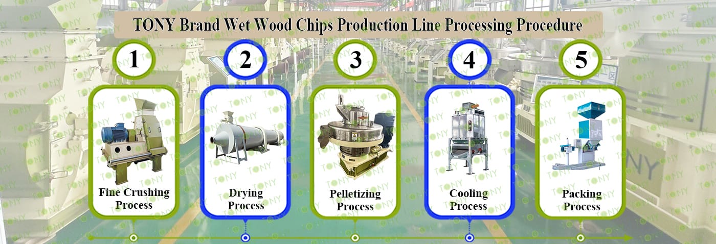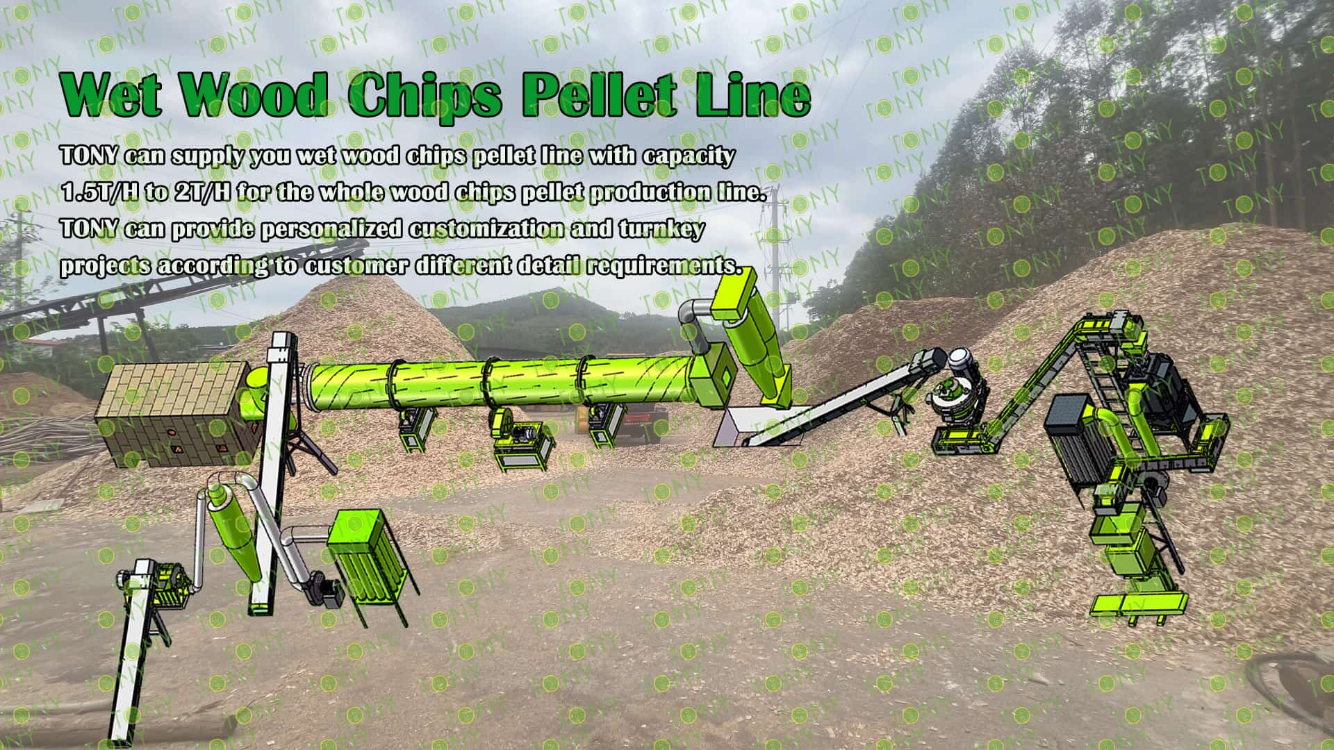 3.TONY Brand 1.5-2Ton /Hour Wet Wood Chips Pellet Line Project Process
