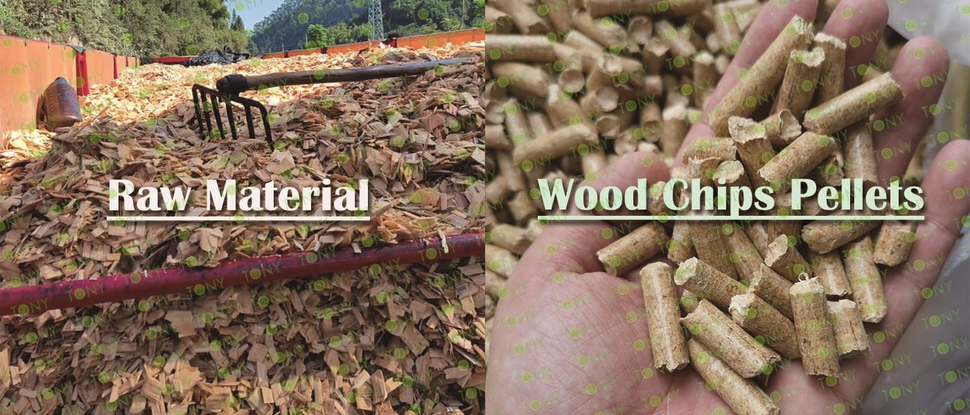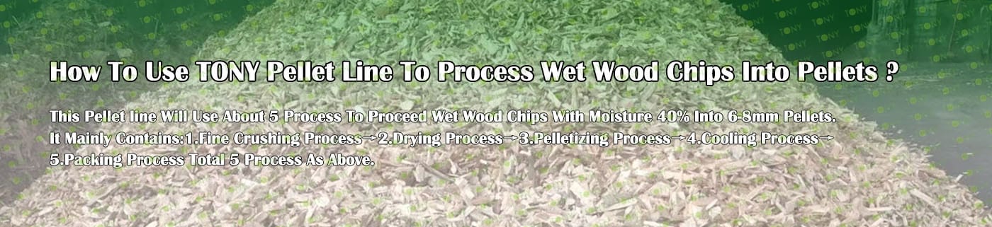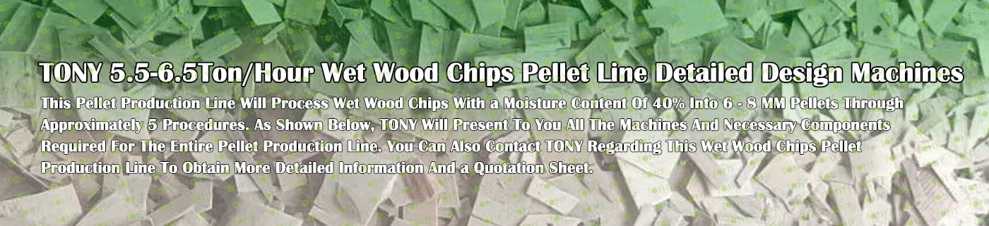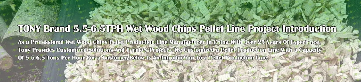 TONY Brand 5.5-6.5Ton/Hour Wet Wood Chips Pellet Manufacturing Plant can take wet wood chips, various types of wood - related biomass materials, such as wood pallets ,branches, wood logs, and wood shavings. After pretreatment and processing, wet wood chips is solidified into high - density wood pellet fuel. This fuel is an ideal substitute for coal and oil and plays a role in energy conservation and emission reduction. At present, it has been widely used in regions rich in wood resources.