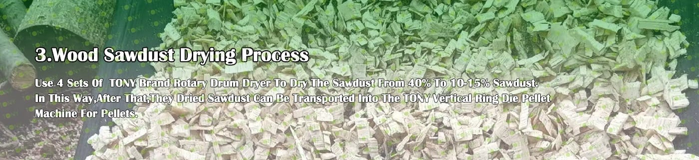 How to use the TONY pellet production line to make pellets from wet wood chips? The process mainly includes the following steps and equipment: 1. Use TONY effective hammer mill to crush the 25-55 mm wood chips into 8-14 mm sawdust. 2.Use TONY large hydraulic storage silo to storage 8-14 mm sawdust 3. Use TONY rotary drum dryer to dry the sawdust with a 40% moisture content down to a moisture content of 10%-15%. 4. Use TONY vertical ring die pellet machine to produce pellets with a diameter of 6-8 mm. 5. Use TONY galvanized cooler to cool the pellets from 80-90°C to 20-30°C. 6. Use TONY ton packing machine to pack the pellets into bags, each weighing 1 ton. For more detailed information and quotations, you can contact TONY. TONY can provide all the above - mentioned products at highly competitive prices and with excellent quality. |
