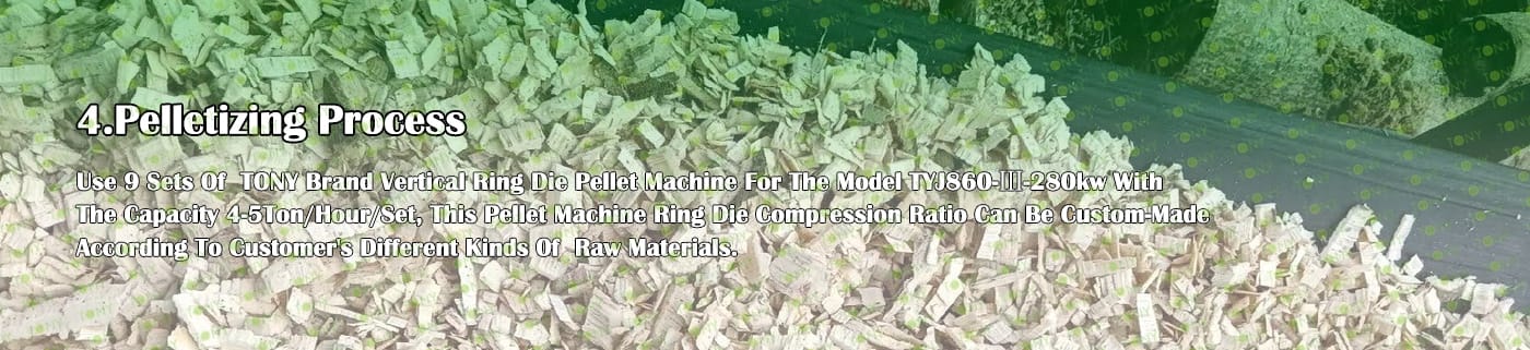 6. Main Equipment: Effective Hammer Mill-TFD100*200-315KW, TONY Large Hydraulic Storage Silo,Rotary Drum Dryer-3.2*24m, TONY Pellet Machine TYJ860-Ⅲ-280KW, Pellet Cooler, Ton Packing Machine and Belt Conveyors