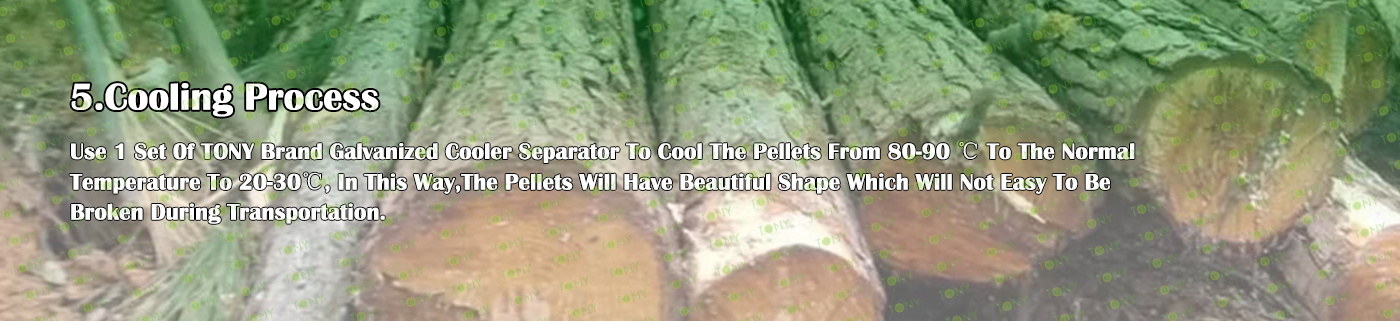 6. Main Equipment: Wood Chipper TPQ216 - 55KW, Effective Hammer Mill-TFD75*132-132KW, Rotary Drum Dryer-1.8*20m, TONY Pellet Machine TYJ551-Ⅲ-132KW, Pellet Cooler, Small Packing Machine and Belt Conveyors