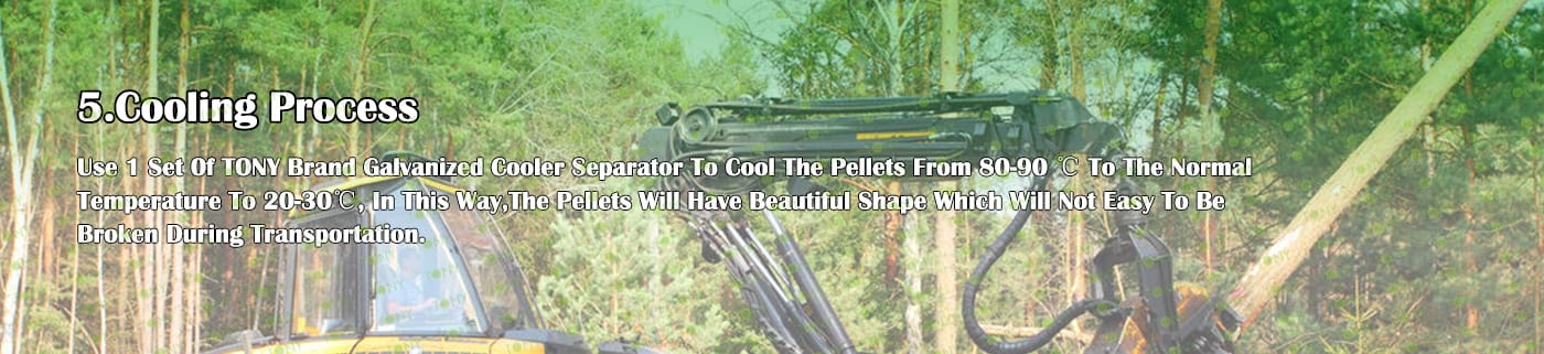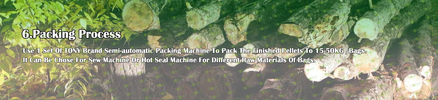 6. Main Equipment: Wood Chipper TPQ216-55KW, Effective Hammer Mill -TFD75*132-132KW, Rotary Drum Dryer-1.8*20m, TONY Pellet Machine TYJ860-Ⅲ-280KW, Pellet Cooler, Small Packing Machine and Belt Conveyors
