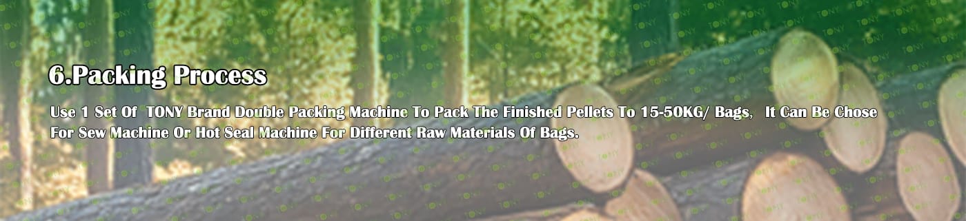 6. Main Equipment: Comprehensive Chipper TPC1000-90KW, Effective Hammer Mill-TFD75*160-160KW, Rotary Drum Dryer-1.8*24m, TONY Pellet Machine TYJ760-Ⅲ-160KW, Pellet Cooler, Double Packing Machine and Belt Conveyors