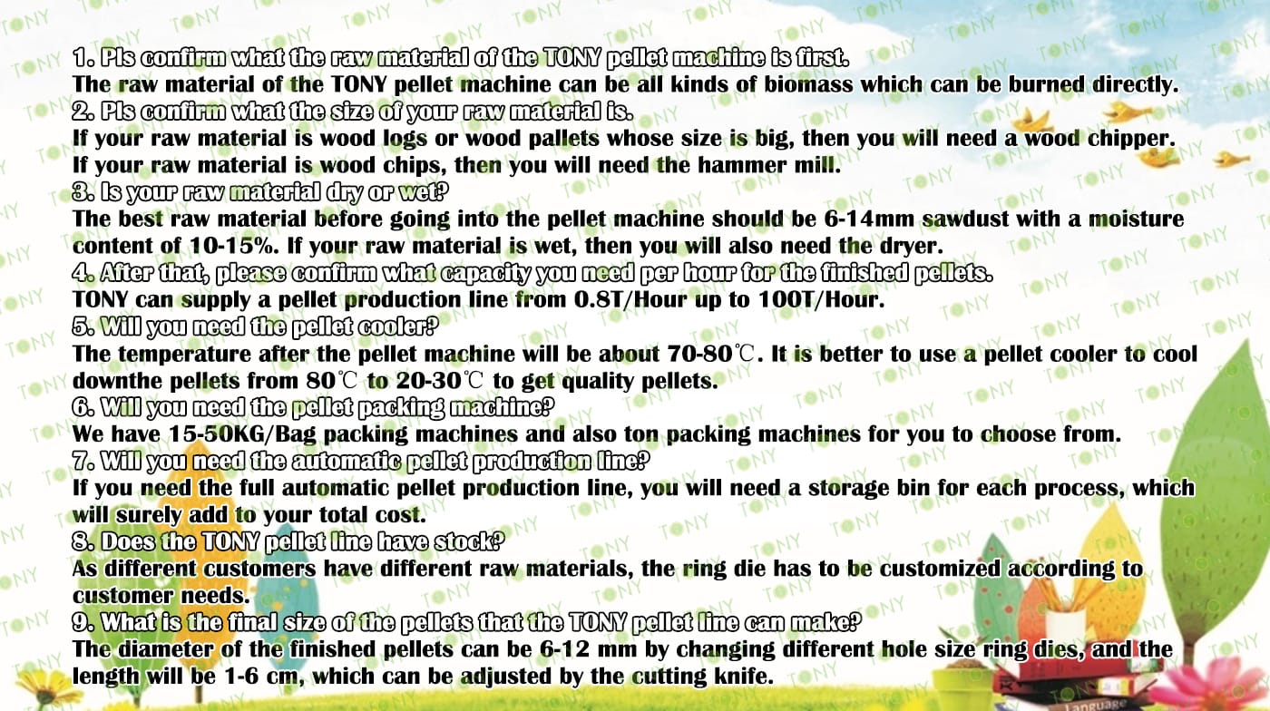 6. Main Equipment: Comprehensive Wood Chipper TPC1000-90KW, Dual Shaft Hammer Mill-TFS65*100-110*2kw, Rotary Drum Dryer-1.8*24m, TONY Pellet Machine TYJ760 - Ⅲ - 185kw, Pellet Cooler,Double Packing Machine and Belt Conveyors