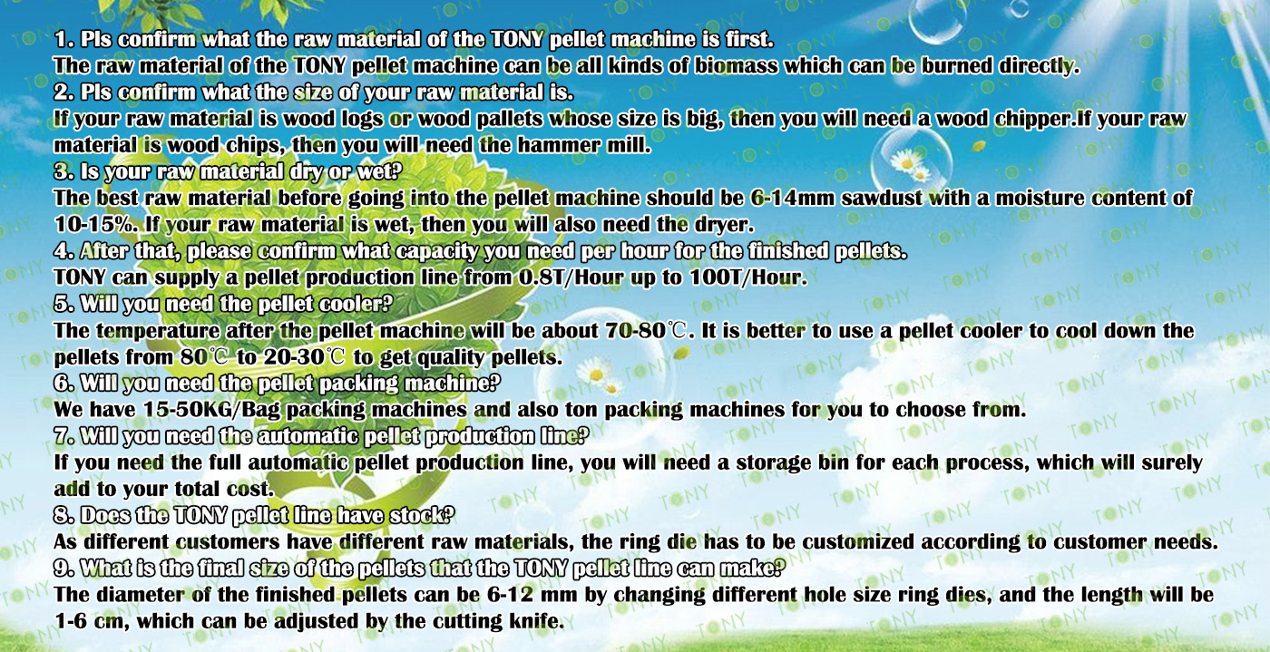 | Next, TONY Will Introduce To You All The Necessary Machinery That Will Be Used For The Whole Pellet Production Line. Some Machines Can Be Custom - Made By Customers According To Different Customers' Detailed Demands. Contact TONY For More Details, Including Quotation And Layout. | |||