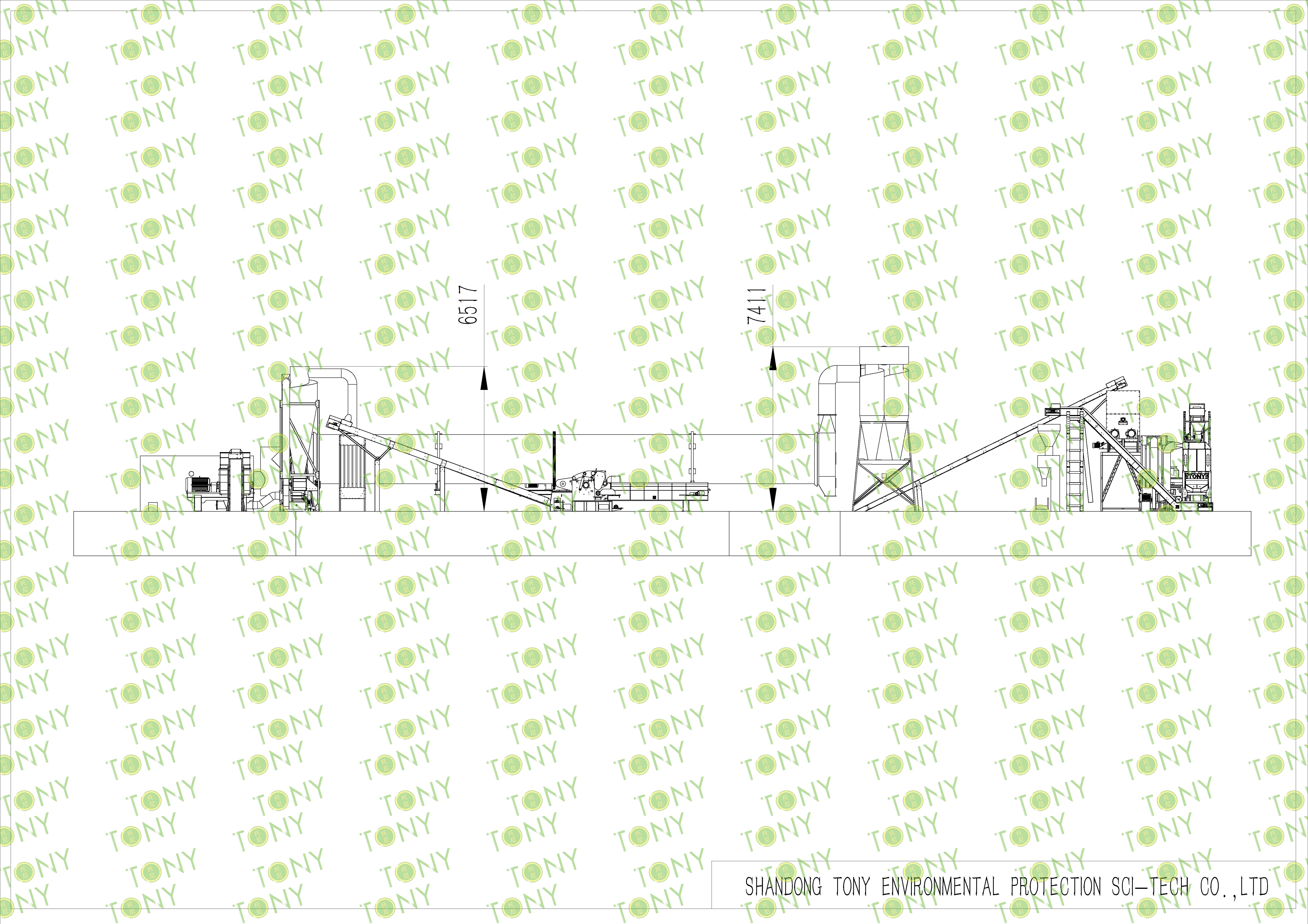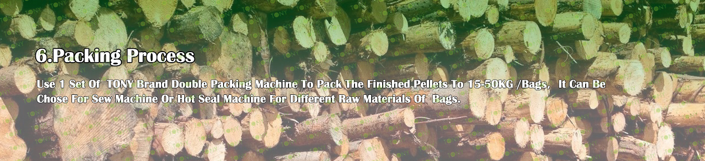 6. Main Equipment: Comprehensive ChipperTPC1000 - 90KW, Effective Hammer mill-TFD85*250-250kw, Rotary Drum Dryer-2.2*24m, TONY Pellet Machine TYJ551 - Ⅲ - 132kw*3 sets, Pellet Cooler, Double Packing Machineand Belt Conveyors